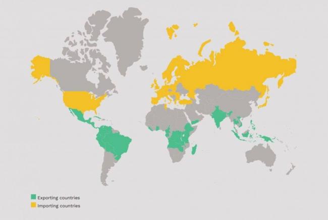 География кофе достаточно обширна. Его экспортируют из стран, которые расположены в субтропиках и тропиках. Там кофейные деревья в должной мере развиваются, отмечается своевременное созревание плодов. Произрастают растения в восьмидесяти государствах на разных материках. Продукция каждого из них обладает рядом особенностей.