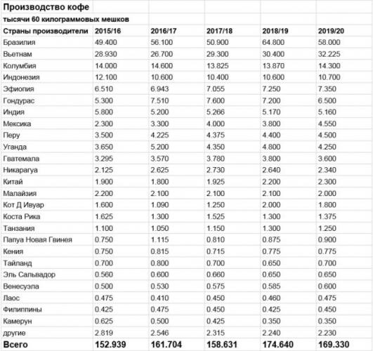 Прогнозируется, что мировое производство кофе на 2019/20 маркетинговый год (МГ) будет на 5,3 млн. мешков (60 кг) ниже, чем в предыдущем году, снизившись до 169,3 млн. В основном из-за того, что бразильские деревья арабики вступают в межгодовой период двухгодичного производственного цикла.