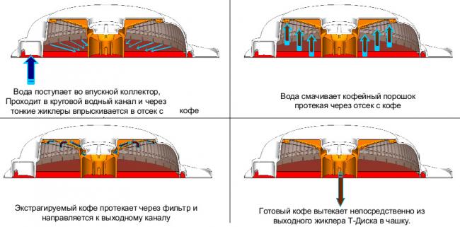 Кофемашины данного типа просты в производстве и эксплуатации. Капсулу закладывают в контейнер, где она прокалывается иглой. Через отверстия проходит пар под давлением, конденсируется и жидкость попадает в кружку. Остатки порошка остаются на фильтре капсулы и вместе с ней оказываются в емкости для их сбора.