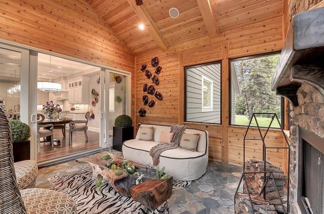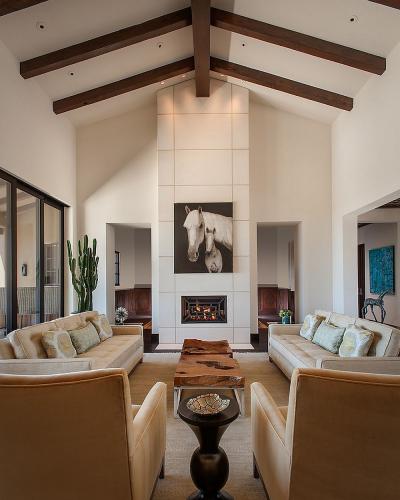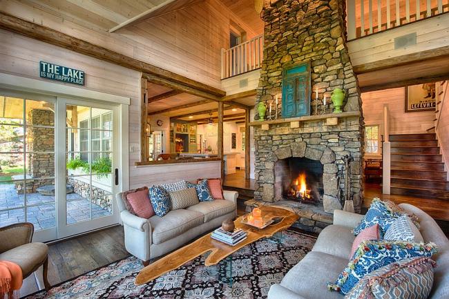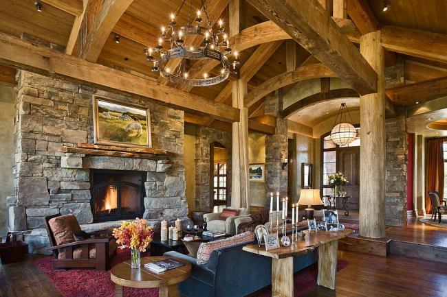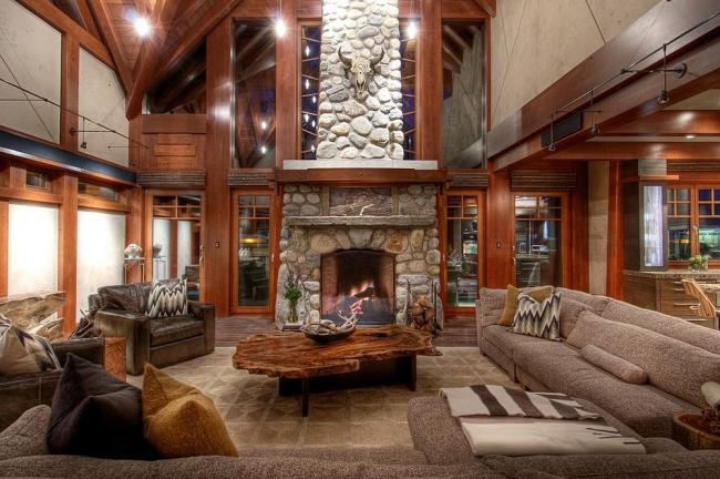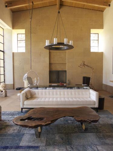 Rustic living room with fabulous live edge table behind the couch [Design: Locati Architects / Roger Wade Studio]