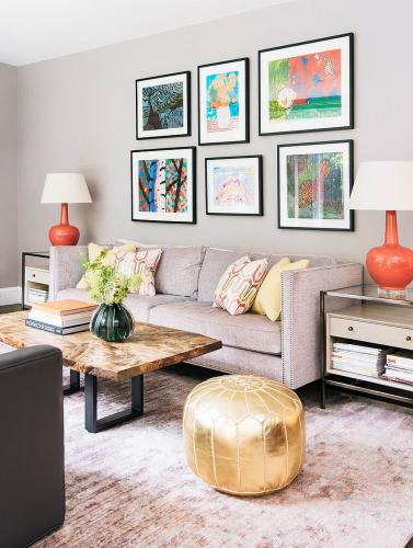 Gray living room with stylish gallery wall and live edge coffee table [From: Meghan Carter Design / Stephani Buchman Photography]