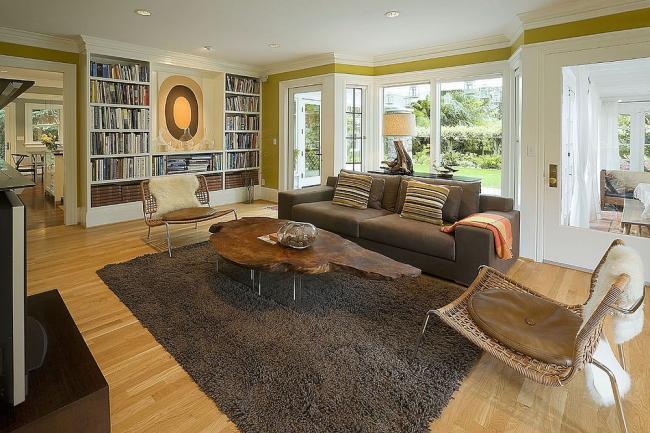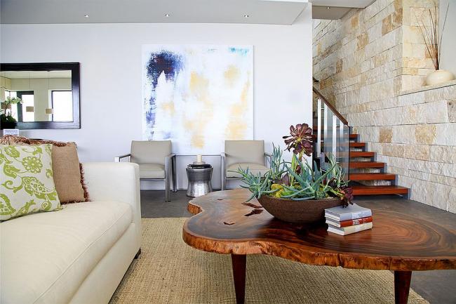 Adding an element of natural wood to the sophisticated contemporary living room completely alters its vibe and creates a cozier and more inviting setting. Since most contemporary and modern living rooms are dominated by glass, stone and other glossy surfaces, the mere presence of wood in the form a live-edge coffee table makes a big difference. This impact is amplified, as the coffee table sits at the heart of the living room and is something you simply cannot miss!