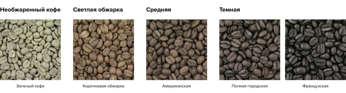 Различают 4 степени обжарки кофейных зерен. От самого слабого до, почти угольного, для приготовления coffea эспрессо.