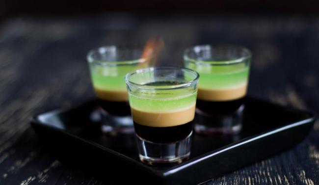 Каждый слой осторожно наливается по лезвию ножа или с помощью барной ложки. При подаче верхний слой поджигается