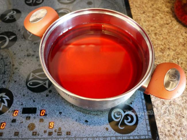 - Вернуть воду, ставшую розовой, в кастрюлю, всыпать сахар, все перемешать и сварить сироп.