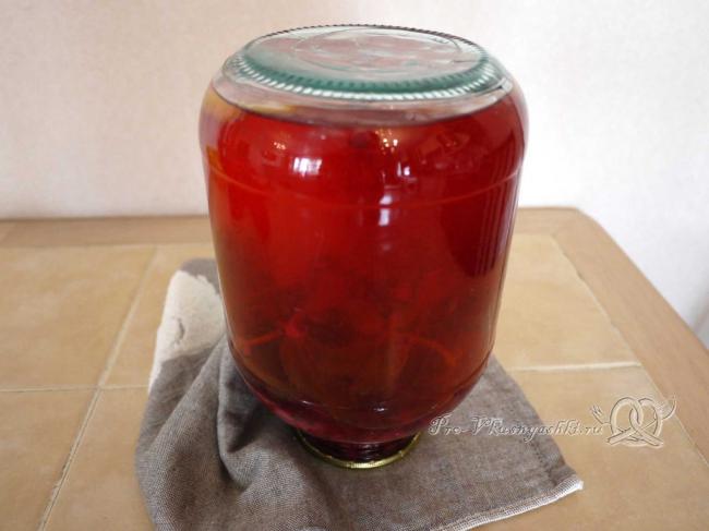 - Перелить компот в стерилизованную банку, закупорить, перевернуть на крышку и укутать.