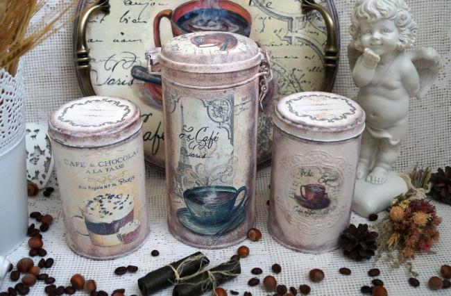 Чайная шкатулка может быть сделана своими руками в технике декупаж. Такой предмет не останется без внимания, он внесет в кухонный интерьер яркую изюминку. Вариант рисунка или картинки, которая украсит коробочку, каждый подбирает самостоятельно.