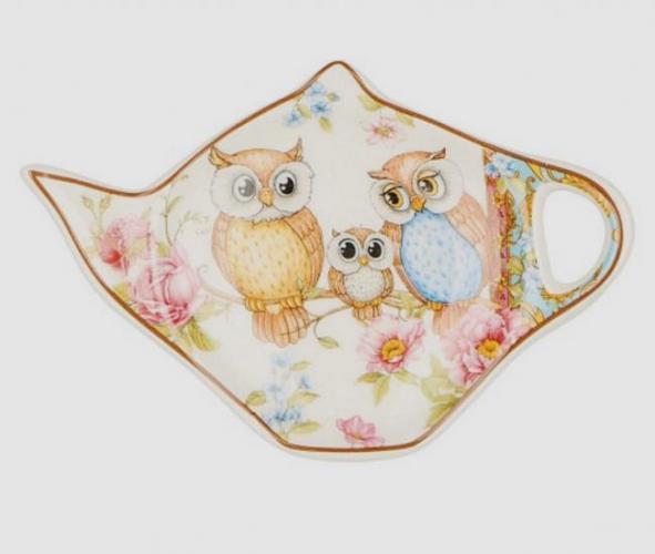 Еще одна неординарная подставка под использованные чайные пакетики, сделанная в виде чайничка. Для изготовления применяется фарфор. Отдельного внимания заслуживает оформление приспособления. На белом фоне нанесен рисунок семейства сов. Выполнено изображение в нейтральных тонах. Смотрятся подставки эффектно. Помогут создать уютную атмосферу в процессе чаепития. Вес прибора – 55 г. Размеры: 80х70х70 мм. Делается в России.