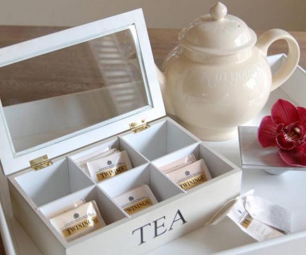 Самый простой способ сделать чайную шкатулку — использовать круглую или прямоугольную металлическую коробку из-под печенья, конфет или чая. Обычно они уже имеют яркий внешний вид. Внутри делаются перегородки, они вырезаются из картона и вставляются в коробку. В полученных отсеках можно хранить различные чайные пакетики, сортируя по сортам и видам.
