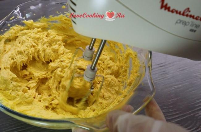 - Добавить масло и ванильный сахар, взбить в пышную пену.