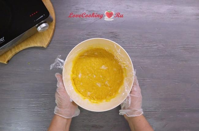 Перекладываем заварную основу в другую ёмкость. Накрываем пищевой плёнкой в контакт, даём остыть до комнатной температуры.