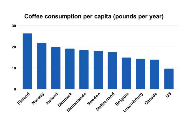 Europeans consume the most coffee per capita worldwide, particularly Scandinavian countries. The only country on the list not located in Europe is Canada!