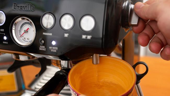 - Тонкой струей влить полученный эспрессо в молоко. Совет: для избегания смешивания напитков можно вливать кофе по ножу.