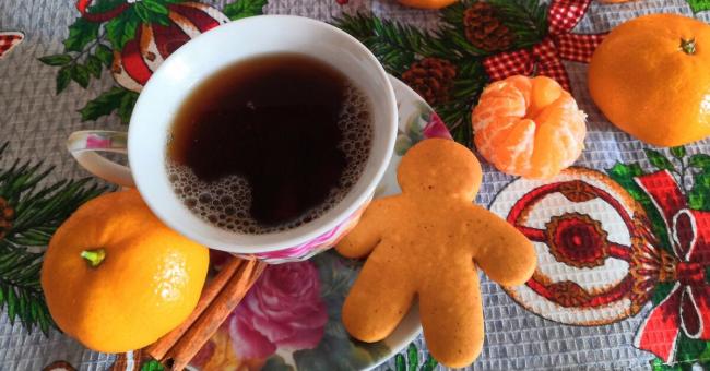 - кожуру 2-3 мандаринов отварить в 500 мл воды + 3 ч.л. заварки черного чая + ½ чл.л. корицы, настоять 5 минут, добавить немного меда (сахара);