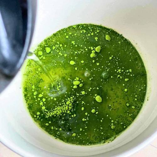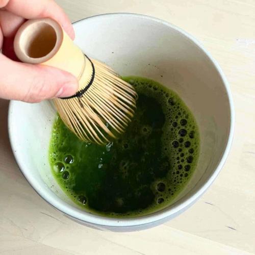 When whisking green tea powder with a bamboo whisk, you want to whisk using a continuous W or M motion. Don’t use circular movements because that will not break up the green tea powder enough.