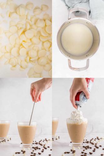 - Start by grabbing a small saucepan and putting the burner on medium-low heat. Heat up your milk (I use whole milk, but you can use whatever fat content you’d like!) and white chocolate chips over med-low heat until melted. Make sure you are stirring constantly, you don’t want your white chocolate chips to burn to the bottom of the pan!
