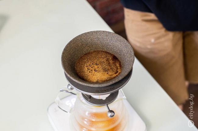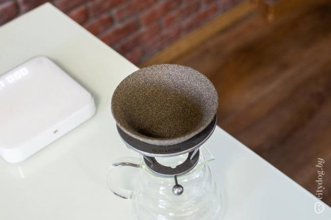 – Новое приспособление, появившееся только в конце 2018 года в очень ограниченном количестве. Это японская пористая керамика, которая пропускает масла, но не пропускает мелкие частицы. В результате получается что-то среднее между фильтр-кофе и тем, что заваривается просто в чашке.