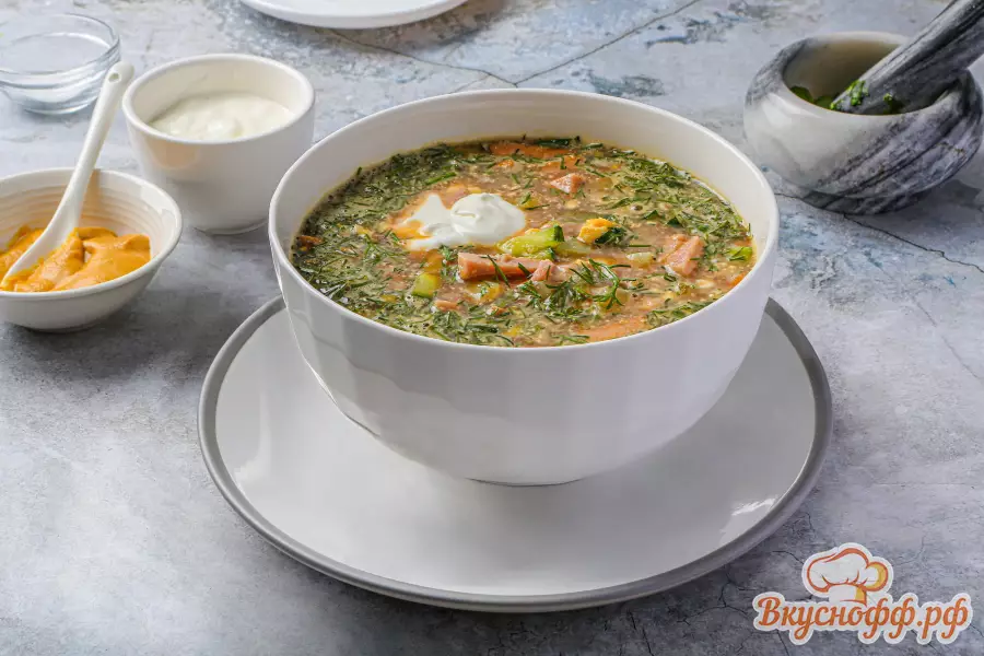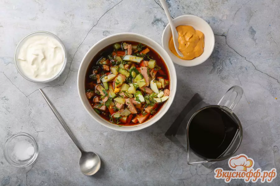 - Раскладываем массу в тарелки, заливаем прохладным квасом, приправляем сметаной и приступаем к трапезе.