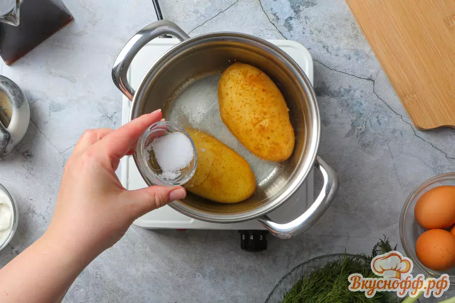 - Сразу отправляем отвариваться в кожуре картофель и яйца.