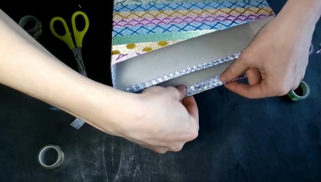 Далее, осталось самое интересное – декор коробки. Берём скотч и обклеиваем органайзер сверху. Не забываем обклеить и срезы.