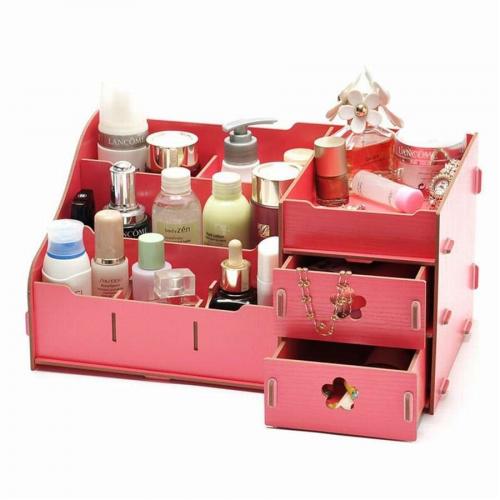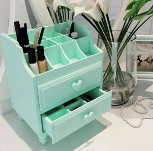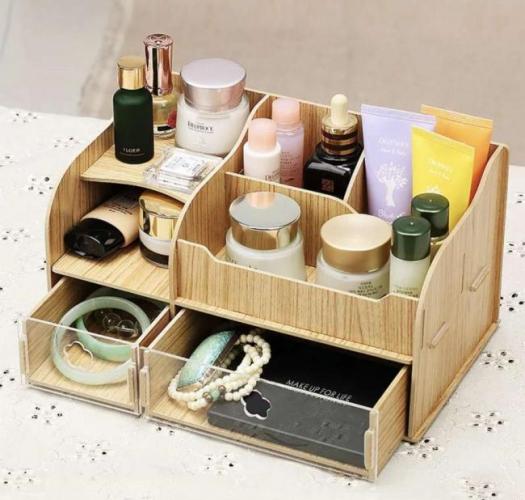 Очередной вариант из дерева/фанеры. Открытые отсеки хороши для ухода, а вот ящички сохранят в целостности вашу декоративку. Удобство в том, что вы можете в любой момент добавить еще сколько угодно отделений.