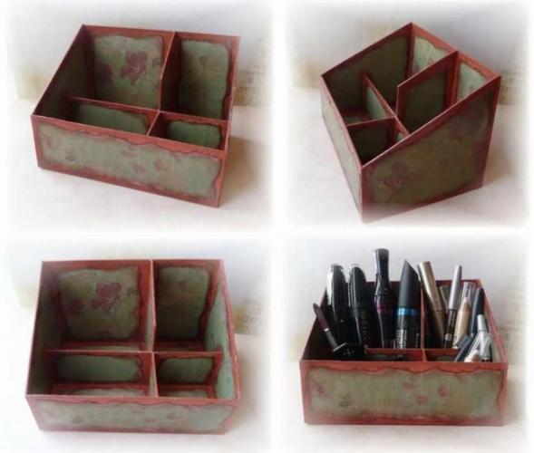 Вновь вариант того, как создаются полезные шкатулки из обычного картона. Украсить картон можно бусинами, бисером, яркой краской. Не забудьте сделать отсек для кистей чуть выше, чем остальные.