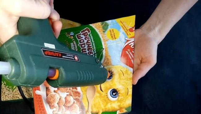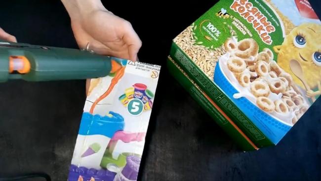Далее, берём клеевой пистолет или обычный клей (если нет клея Момент, можно использовать ПВА, вот только ПВА будет долго сохнуть) и промазываем боковую часть коробки.