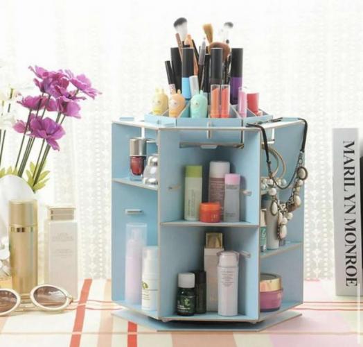 А вот, наконец, подходящая идея для той, что любит и уходовую косметику, и декоративную. Подвижную конструкцию сделать легче, чем кажется. Можно приобрести отдельно крутящийся механизм и спрятать его между двумя тонкими пластами дерева.