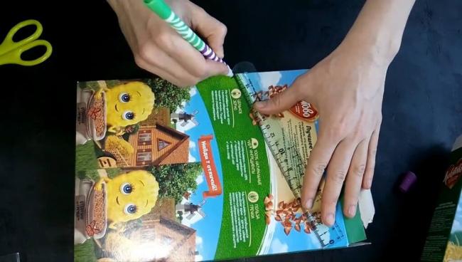 Проводим линию карандашом, применяя линейку. Чертим с одной ии с другой стороны, отмеряя по линейке одинаковое расстояние от низа коробки. Угол наклона небольшой.