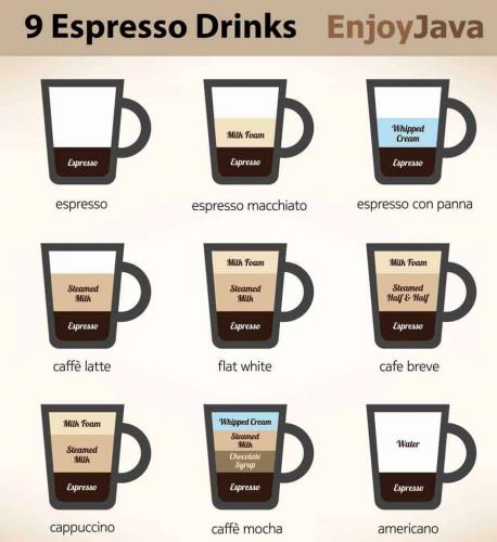 9 Espresso based coffee drinks compared with Americano coffee