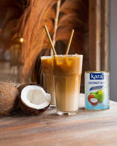Кокосовые сливки хорошо смешиваются с кофе, добавляют нотку сладости и привкус кокосового ореха, хорошо сочетаются с темной обжаркой и холодными напитками. Чтобы избежать слишком яркого вкуса кокоса и не потерять кофейные нотки, кокосовое молоко часто разбавляют более нейтральным соевым или овсяным.