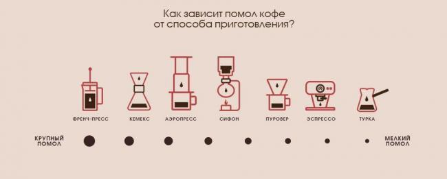 Обычное правило, которое помогает сориентироваться, как молоть зерна для различных методов изготовления: чем подольше кофе контактирует с водой во время заваривания, тем крупнее нужен помол. Исключение одно: турка, где маленький помол делает приятную густую консистенцию.