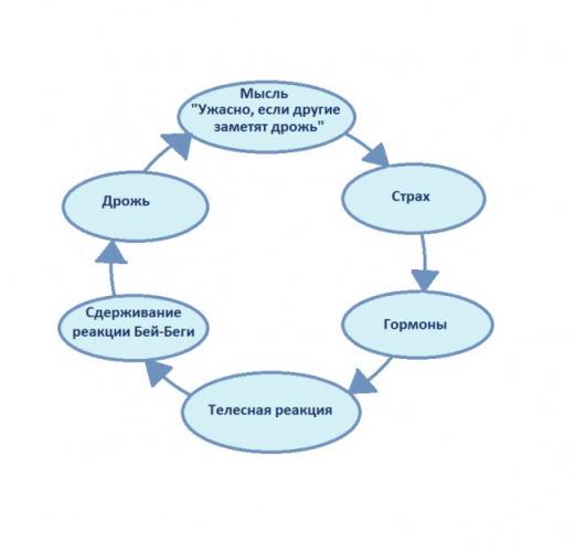 Мысль о том, что другие люди заметят дрожь, приводит к ее усилению. Образуется замкнутый круг, при котором эта мысль вызывает страх произвести плохое впечатление, а тот приводит к выбросу гормонов стресса. Гормоны запускают телесную реакцию на стресс. При сдерживании реакции «Бей или беги» появляется дрожь.