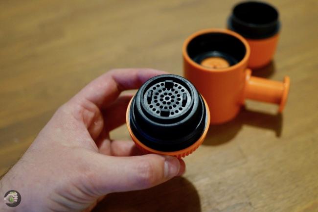 Соответственно, чтобы приготовить эспрессо, нам нужна кофейная таблетка (формируется в первом отсеке), кипяток (заливается в стакан с другой стороны) и давление. Давление создается при нажатии на ручку с удобной резиновой насадкой.