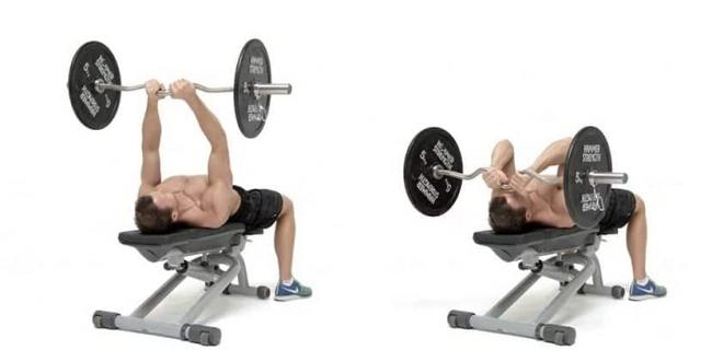 - Когда вы опускаете штангу ко лбу, не разводите локти, так как вы потеряете набор волокон трицепса. Сосредоточьтесь на сведении локтей вместе у головы.