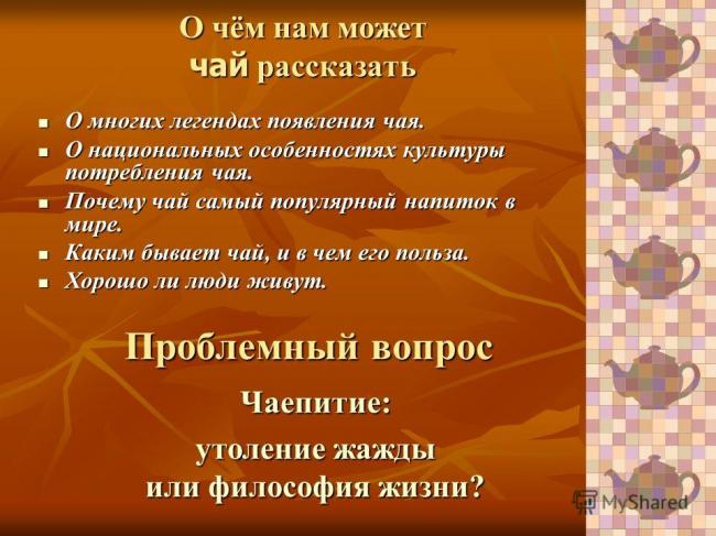 О чём нам может чай рассказать О многих легендах появления чая. О многих легендах появления чая. О национальных особенностях культуры потребления чая. О национальных особенностях культуры потребления чая. Почему чай самый популярный напиток в мире. Почему чай самый популярный напиток в мире. Каким бывает чай, и в чем его польза. Каким бывает чай, и в чем его польза. Хорошо ли люди живут. Хорошо ли люди живут. Проблемный вопрос Чаепитие: утоление жажды или философия жизни?