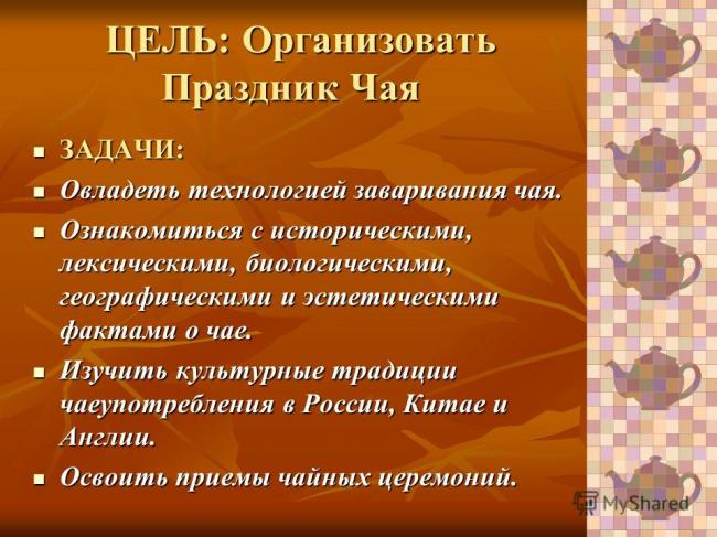 ЦЕЛЬ: Организовать Праздник Чая ЦЕЛЬ: Организовать Праздник Чая ЗАДАЧИ: ЗАДАЧИ: Овладеть технологией заваривания чая. Овладеть технологией заваривания чая. Ознакомиться с историческими, лексическими, биологическими, географическими и эстетическими фактами о чае. Ознакомиться с историческими, лексическими, биологическими, географическими и эстетическими фактами о чае. Изучить культурные традиции чаеупотребления в России, Китае и Англии. Изучить культурные традиции чаеупотребления в России, Китае и Англии. Освоить приемы чайных церемоний. Освоить приемы чайных церемоний.