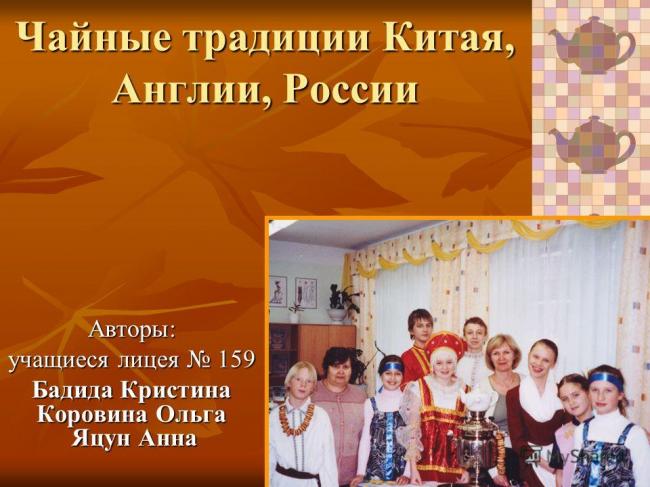 Презентация на тему: ” Чайные традиции Китая, Англии, России Авторы: учащиеся лицея 159 Бадида Кристина Коровина Ольга Яцун Анна.” — Транскрипт: