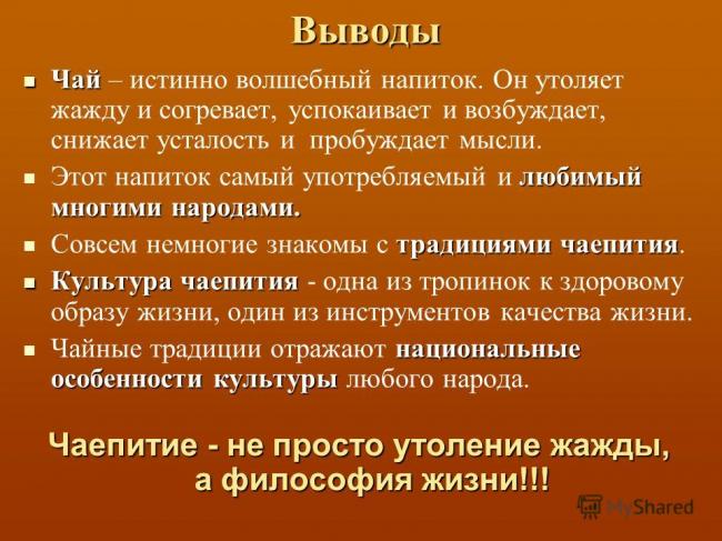 Выводы Выводы Чай Чай – истинно волшебный напиток. Он утоляет жажду и согревает, успокаивает и возбуждает, снижает усталость и пробуждает мысли. любимый многими народами. Этот напиток самый употребляемый и любимый многими народами. традициями чаепития Совсем немногие знакомы с традициями чаепития. Культура чаепития Культура чаепития – одна из тропинок к здоровому образу жизни, один из инструментов качества жизни. национальные особенности культуры Чайные традиции отражают национальные особенности культуры любого народа. Чаепитие – не просто утоление жажды, а философия жизни!!!