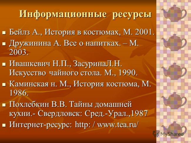 Информационные ресурсы Информационные ресурсы Бейлз А., История в костюмах, М Бейлз А., История в костюмах, М Дружинина А. Все о напитках. – М Дружинина А. Все о напитках. – М Ивашкевич Н.П., ЗасуринаЛ.Н. Искусство чайного стола. М., Ивашкевич Н.П., ЗасуринаЛ.Н. Искусство чайного стола. М., Каминская н. М., История костюма, М Каминская н. М., История костюма, М Похлебкин В.В. Тайны домашней кухни.- Свердловск: Сред.-Урал.,1987 Похлебкин В.В. Тайны домашней кухни.- Свердловск: Сред.-Урал.,1987 Интернет-ресурс: http: / Интернет-ресурс: http: /