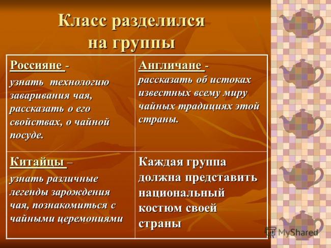 Класс разделился на группы Россияне Россияне – Россияне узнать технологию заваривания чая, рассказать о его свойствах, о чайной посуде. Англичане Англичане – рассказать об истоках известных всему миру чайных традициях этой страны. Англичане Китайцы Китайцы – Китайцы узнать различные легенды зарождения чая, познакомиться с чайными церемониями Каждая группа должна представить национальный костюм своей страны