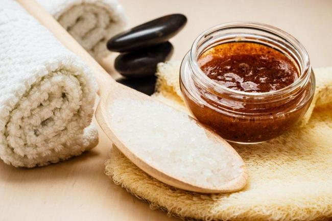 Для более тщательного отшелушивания и бактерицидного действия приготовьте скраб с солью. Лучше использовать мелкую. В состав входит: кофе, соль, растительное масло (оливковое). Соотношение ингредиентов 1:2:2.