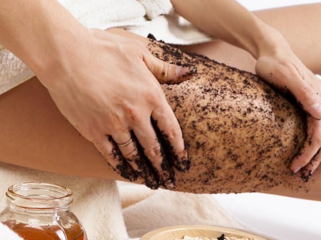 1 ст. ложку кофе или гущи смешать с 2 ст. ложками мёда. Полученную кашицу нанести на предварительно распаренную кожу, втирая круговыми движениями по часовой стрелке. По истечении 15 минут смыть тёплой водой.