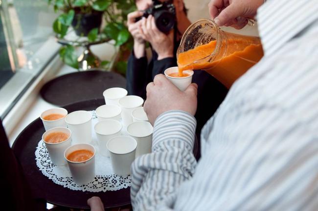 Потом гостеприимные хозяева предложили попробовать несколько смузи. Это разливают для дегустации «Яркий оранжевый» (морковка-яблоко-сельдерей).