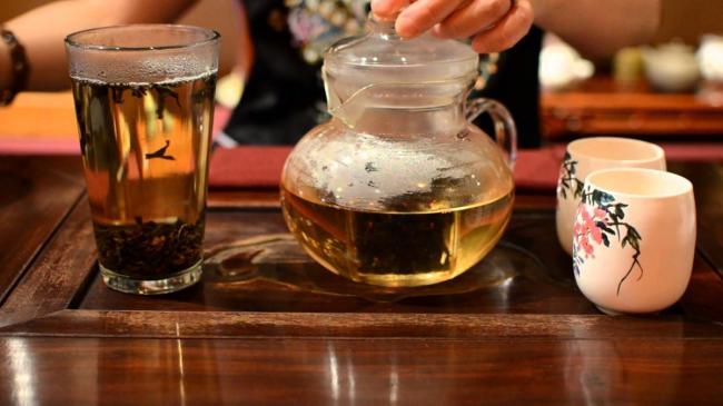 - Через 4-5 минут после нулевого заваривания, когда листки полностью раскроются, чай залить горячей водой (помните, не кипятком) и подождать 35-55 секунд. Затем напиток переливают в специальную стеклянную емкость, которая называется Ча Хай.