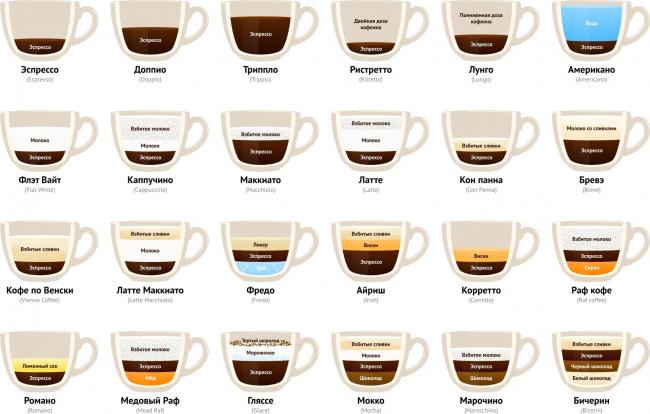 На основе эспрессо делают вот эти напитки, их много: