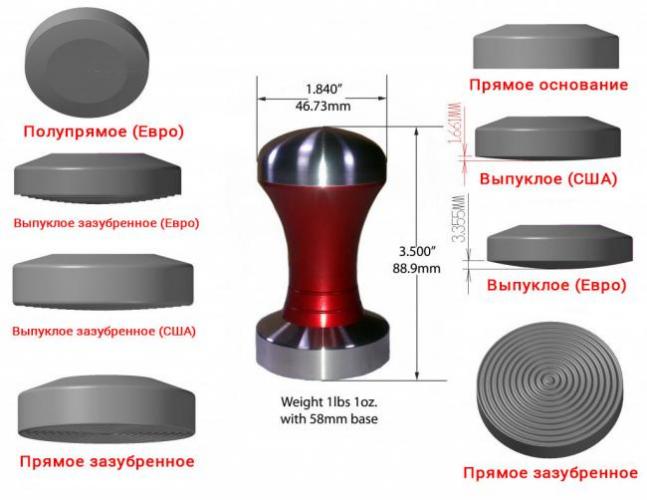 Темпер для кофе может обладать различными размерами и формами. Подобные инструменты классифицируют еще и по материалу, из которого они изготовлены. Основа аксессуара может быть не только плоской, но и овальной. При этом нет точных рекомендаций по выбору темпера. В Америке традиционная форма – овальная, а в Европе – плоская.