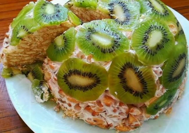 Киви можно заменить другими фруктами, например, консервированными персиками. Такой тортик обязательно оценят ваши родные и друзья!