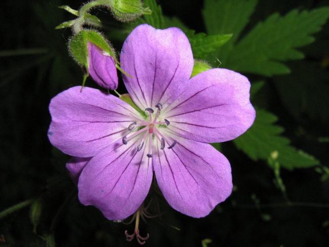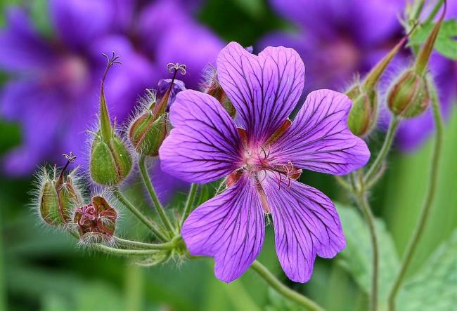 Нежные фиолетовые цветочки герани никого не оставят равнодушным. Они довольно крупные (до 5 см в диаметре), с пятью лепестками, широко раскрытые. Герань применяется как лекарственное растение.