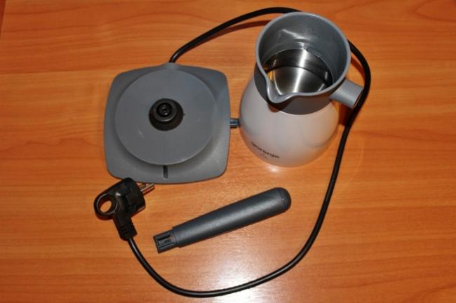 Поставляется в стальном корпусе, поэтому отличается долговечностью. Ручка устройства съемная, при хранении электрическая турка не занимает много места. Мощность прибора равна 480 Вт.